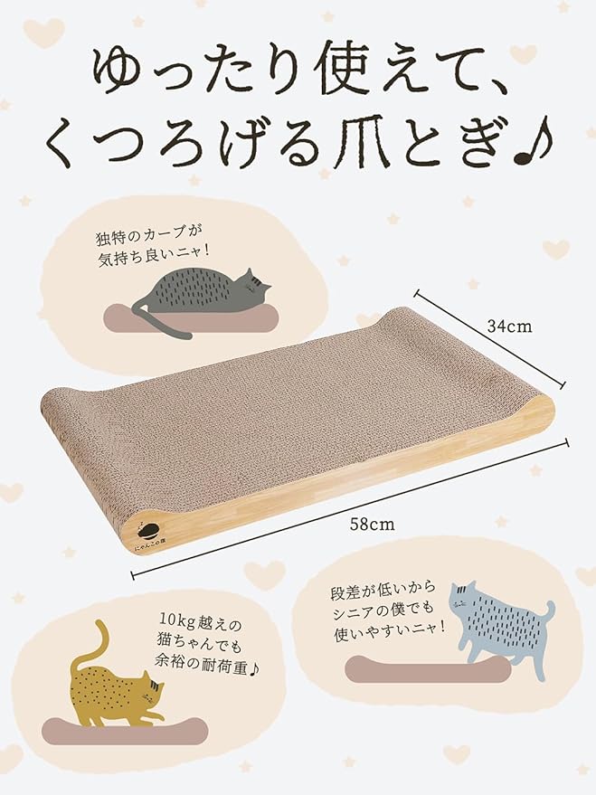 【 耐久性 】通常の段ボールの10倍の強度を誇る4層強化段ボールを使用しているので一般的な爪とぎより長持ち。だからカスが出にくい【猫ちゃんのからだにフィット】どちらの面も絶妙な角度のカーブで猫のやわらかいからだにフィットします。