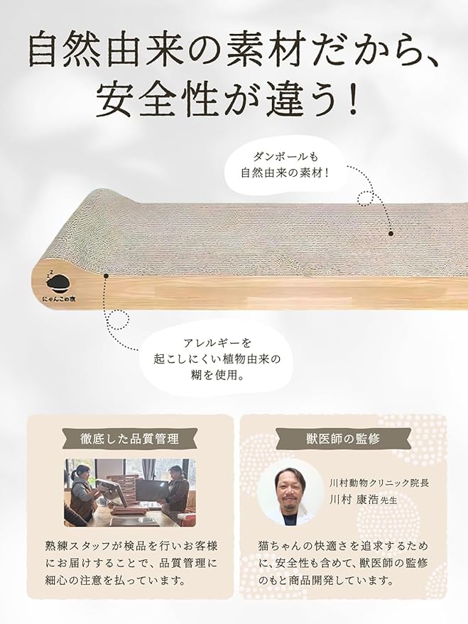 【 自然素材なので安心 】原料100%紙でこだわりの段ボール。段ボールの接着には植物由来の糊を使用。自然素材なので安心。手や肉球をなめても心配がないよう、ダンボールを貼り合わせる際に使用している糊は、とうもろこしを主原料とした天然素材の糊を使用