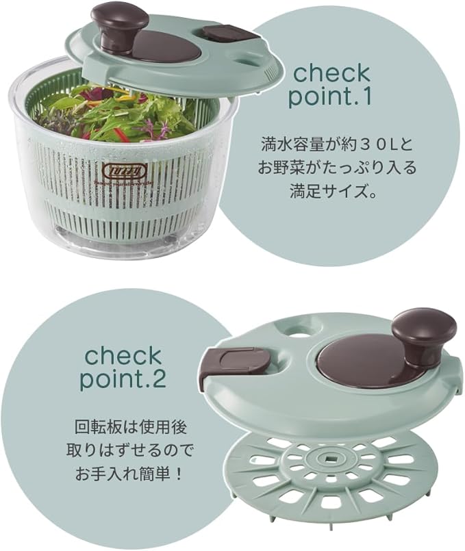 ハンドルを回すだけで簡単に野菜の水切りができます。水切り穴つきで便利!回転板が取りはずせてお手入れもカンタンです。