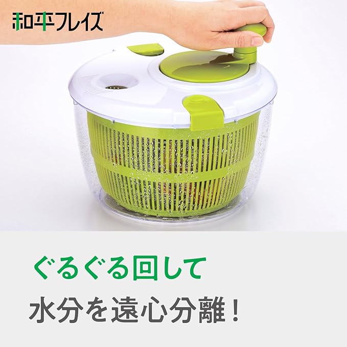 食材を中に入れてぐるぐる回すだけで、素早く水分が遠心分離されます。シャキシャキのサラダ作りに重宝しますよ!水分をしっかり切ることで、ドレッシングがよく絡みます。ヘルシーなサラダを手軽に作りたい方にぴったり!ぜひお試しください。