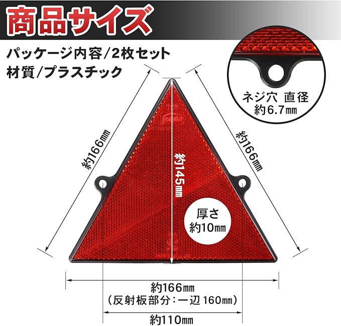 【セット内容】三角反射板:2枚セット 【サイズ(約)】一辺:166mm(反射板部分:一辺 160mm) 厚さ:10mm 垂直高さ:145mm ネジ穴:直径6.7mm ネジ間ピッチ:110mm 【カラー】レッド 【材質】プラスチック