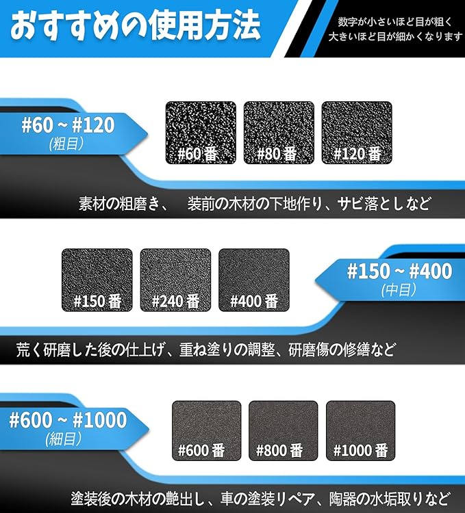 【コスパ抜群ですサンドペーパー】は面倒な磨き作業をを1つのセットIROKCAKPT紙やすりだけで完結させます、#60~#120:素材の粗磨き、塗装前の木材の下地作り、サビ落としなど#150~#400:荒く研磨した後の仕上げ、重ね塗りの調整、研磨傷の修繕など#600~#1000:塗装後の木材の艶出し、車の塗装リペア、陶器の水垢取りなど