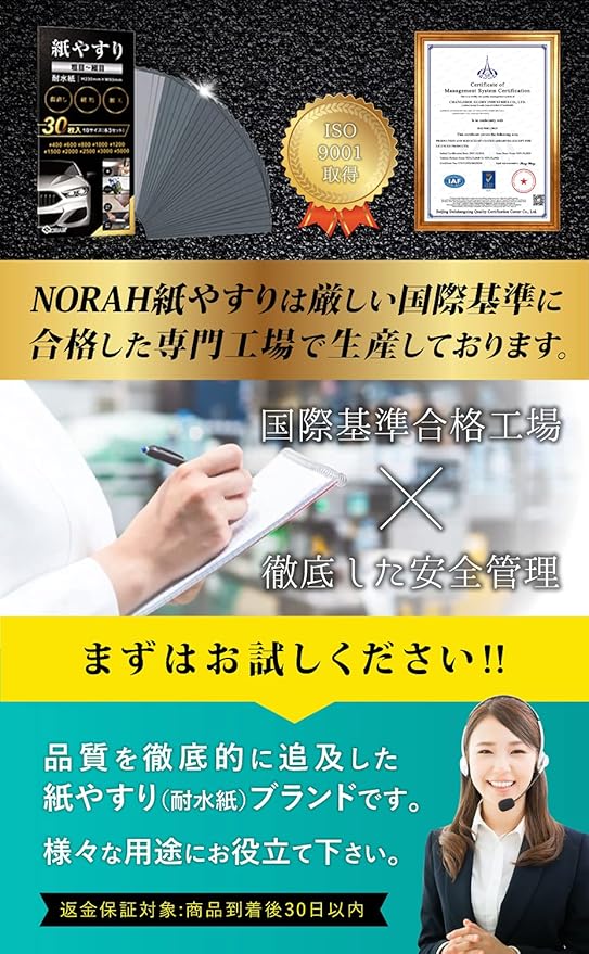 【国際基準の紙やすり】ISO9001に合格して紙やすり専門認定工場で生産しております。 【メーカー3年間の品質保証】 当商品は業界最長の3年間の品質保証が付いております。 万が一、商品に品質問題がある場合は返金や新品交換の対応をさせていただきますので、ご安心くださいませ。