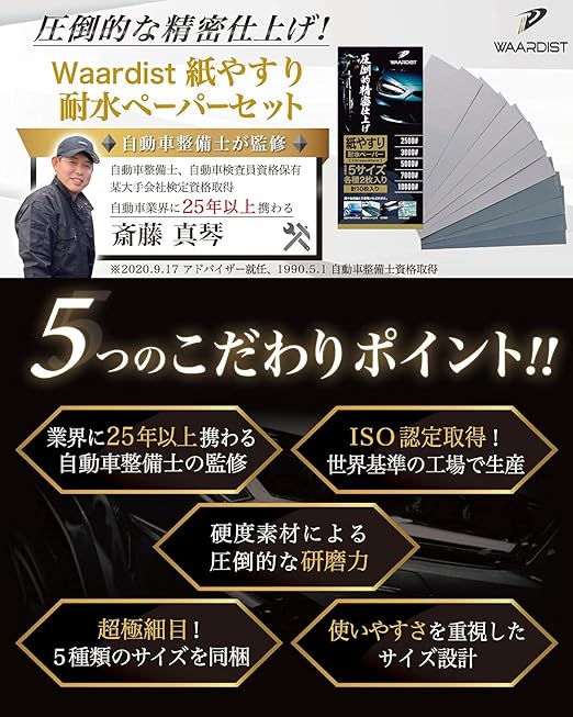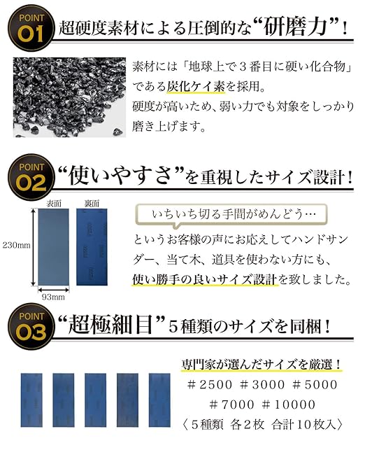 1000#2000#2500#3000#5000#縦230mm 横150mm 各サイズ10枚づつ計10枚入りの紙やすり 耐水ペーパー セットになります。 【こだわり】かみやすり サンドペーパーを製造している十数社の工場から品質、機能を共に追及して頂いたISO9001認定取得の紙ヤスリ工場と提携しております。 “研磨力”に重点を置き、素材には地球上で3番目に硬い化合物である炭化ケイ素を採用しました。 【専門家の監修】紙やすりを選ぶうえで欲しい番手が足りない、1枚のサイズが大きくて番手を揃えると費用がかさむ、いちいちサイズ調整をする手間がめんどくさい。 そんな声をお聞きし専門家監修の元、精密仕上げに最適な5種類を厳選し使い勝手の良いサイズ選定を致しました。 【使用用途】ヘッドライト、車&バイクのメンテナンス、水回りのクリーニング、包丁やナイフ等の刃物研ぎ、プラモデルの仕上げ、その他様々な用途でご利用頂ける紙ヤスリ 耐水ペーパーセットです。