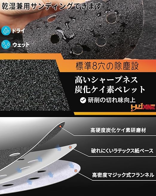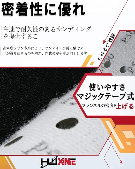 【使いやすいマジックテープ式】サンドペーパー簡単に吸着が良い で外れることはありませんし、優れた密着性により作業時間を短縮し、研削効率を向上させます;8つのダスト除去穴が研削時の発熱を効果的に低減するため、ワークピースの焼け付き防止や粉塵蓄積の抑制が可能、作業効率をさらに高めます