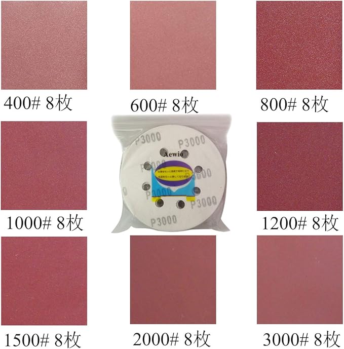 粒度: 64枚に8タイプ(#400 #600 #800 #1000 #1200 #1500 #2000 #3000 各8枚)。マジック式で粒度の交換が簡単にでき、繰返し脱着できます。