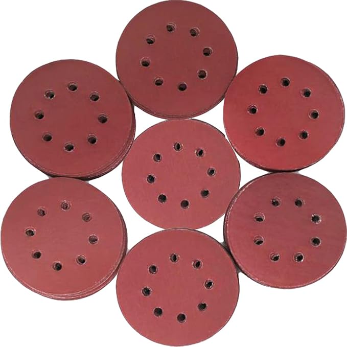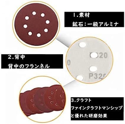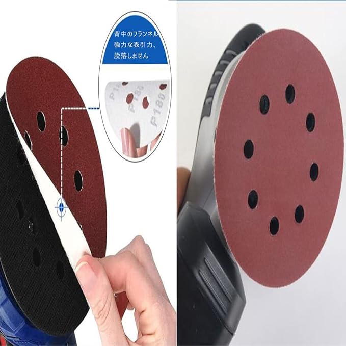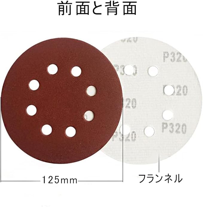 【背面タイプ】 直径125mm/8穴タイプのペーパーに対応。背面は高品質なフランネル材質を採用しております。粘着性が優れて、とても便利に取り外しや交換することができます。異なる研削ニーズに従って砂の異なるカテゴリーが素早く変えることができ、操作が簡単です。研磨ディスク保護パッドx1。
