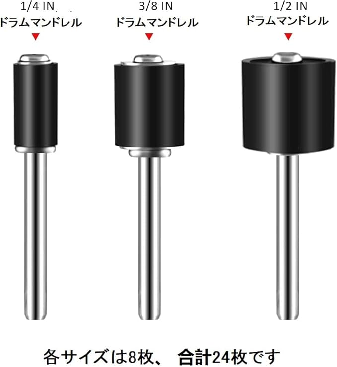 パッケージに含まれるもの-360個のサンディングバンドと24個のサンディングドラムマンドレル、合計384個のドラムサンダーセットが付属。