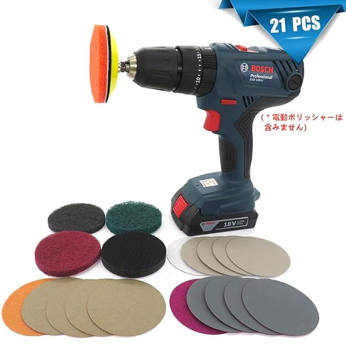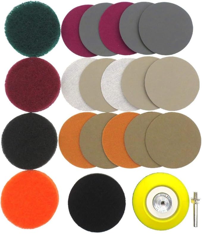 75mm研磨キット:15枚耐水紙やすり(5x2000番、5x5000番、5x10000番)、4枚ナイロン研磨タワシ(1x240#、1x400#、1x1000#、1x2000#)、1xサンディングパット、1x曲面用スポンジアダプター。