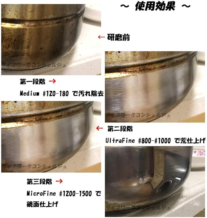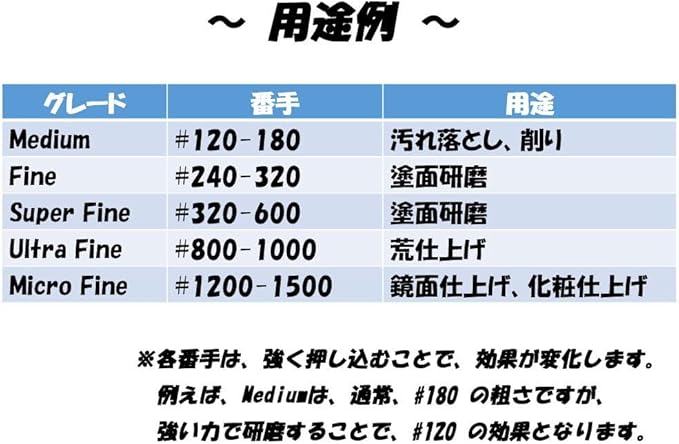 グレード : Medium #120-180、Fine #240-320、Super Fine #320-600、Ultra Fine #800-1000、Micro Fine #1200-1500