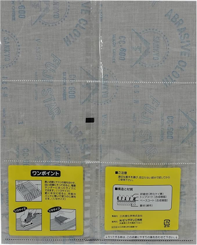 ・ワンポイント:黒い点線にヤスリの端を合わせ、白い点線にそって切ると、電動サンダーに合ったサイズにできます。(1/3サイズ)更に半分に切ると、市販のパッドに巻いて使うのに便利です。(1/6サイズ)