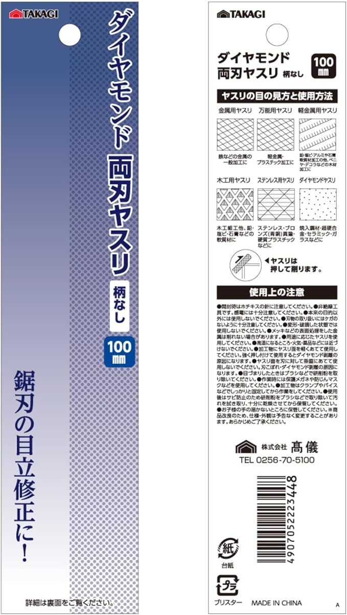 高儀 ダイヤモンドヤスリ 両刃 柄なし 100mm TAKAGI 鋸刃の目立修正 たかぎ