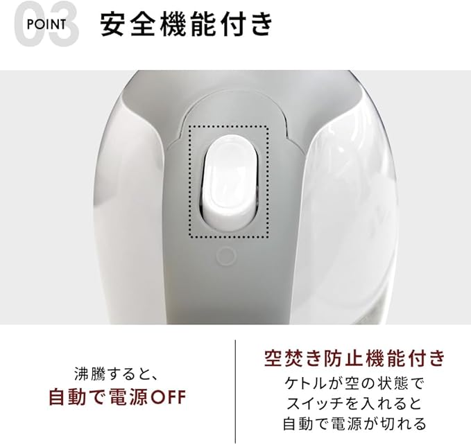 【安心安全機能】①自動電源OFF:沸騰すると自動で電源が切れる機能です。②空焚き防止機能:本体が空の場合、動作しない機能なので、安全です。