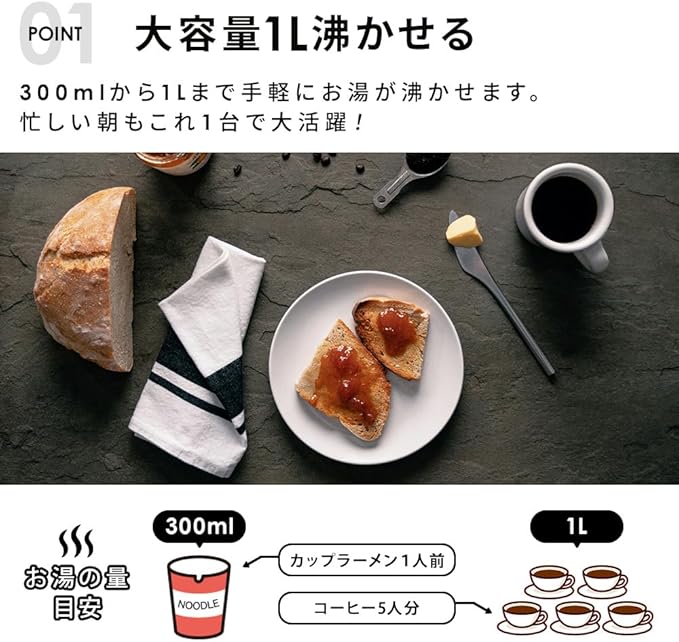300mlからでも沸かす事ができるので、一人前のカップラーメンや5人分のコーヒーまで使用可能。