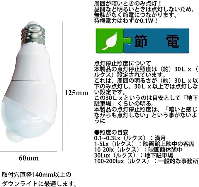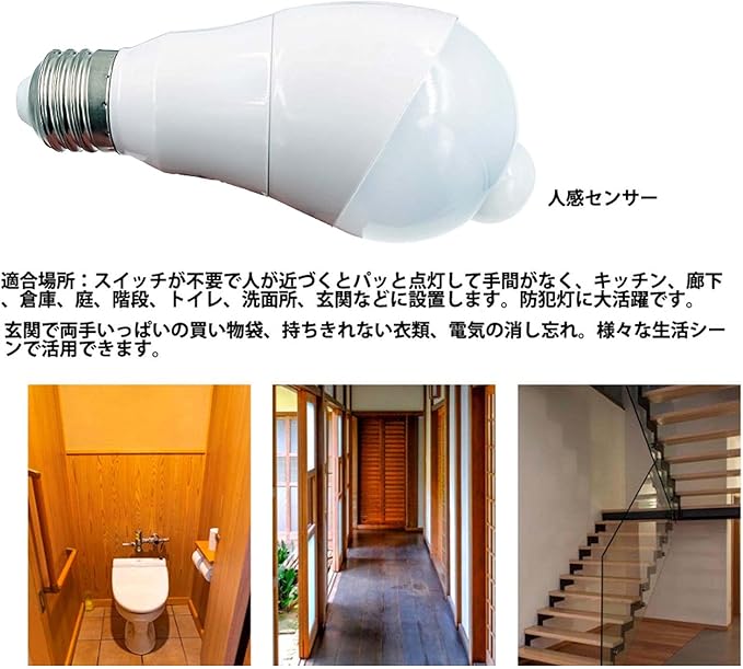 【取り付け簡単】口金部分をソケットにしっかり合わせて取り付けてください、面倒な工事不要。感知角度は約120度、点灯時間もちょうどいいくらいです。必要な時だけパット点灯し、便利で省エネ!下向きの感知距離は約3-5メートルです。明るい場所では常時消灯