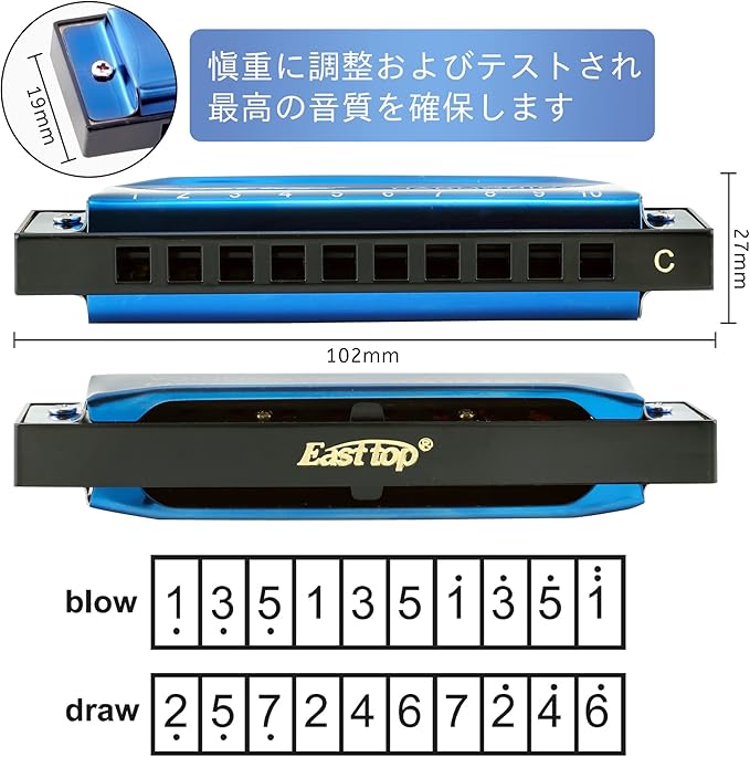 East top ハーモニカ 初心者 ブルースハーモニカ C調 10ホールズハーモニカ 10穴 ステンレスカバー ダイアトニックハーモニカ 清潔布 初心者、学生、専門家 勉強や練習用 のプレゼントに適しています(T003-ブルーC)