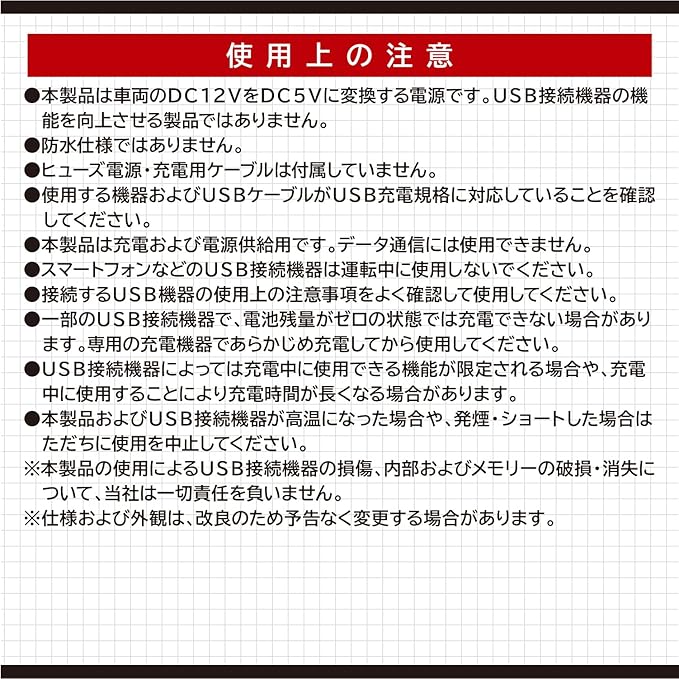 本製品は車両のDC12VをDC5Vに変換するUSB電源ポートです。USB機器の機能を向上させる製品ではありません。電源へ接続するためのヒューズ電源などは付属していません。
