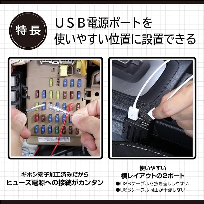 2ポート合計MAX4.8A出力でUSB接続機器を2台同時に充電可能。 ・USB電源ポートを使いやすい位置に設置できる。 ・ギボシ端子加工済みだからヒューズ電源への接続がカンタン。 ・コンパクトで貼り付けしやすい。 ・使いやすい位置に貼り付けてiphone、android等のスマホやタブレット、IQOSアイコスなど電子タバコ・加熱式タバコの充電が可能に。