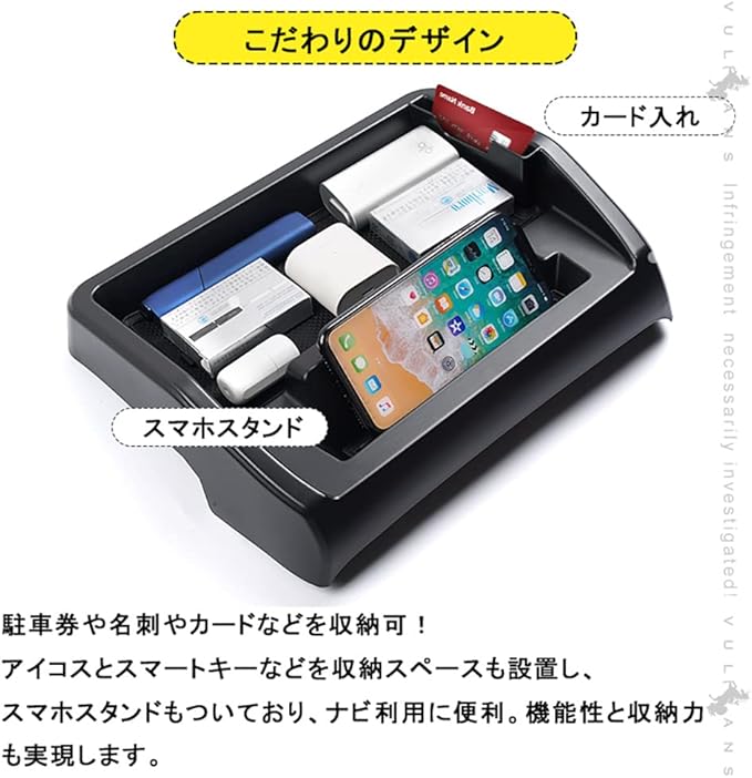 車内雰囲気に溶け込みやすいブラックを採用しますので、違和感なく装着でき、高級感アップ!<BR> こだわりのデザイン<BR> 駐車券や名刺やカードなどを収納可!<BR> 電子タバコとスマートキーなどを収納スペースも設置し、スマホスタンドもついており、ナビ利用に便利。機能性と収納力も実現します。<BR> 実車に何度もフィッテイング確認を実施し車体もイメージを壊さず、丁寧に寸法をとった完全車種専用設計です。お車の雰囲気を損なう事なく最高のフィッティングを体感してください。<BR>