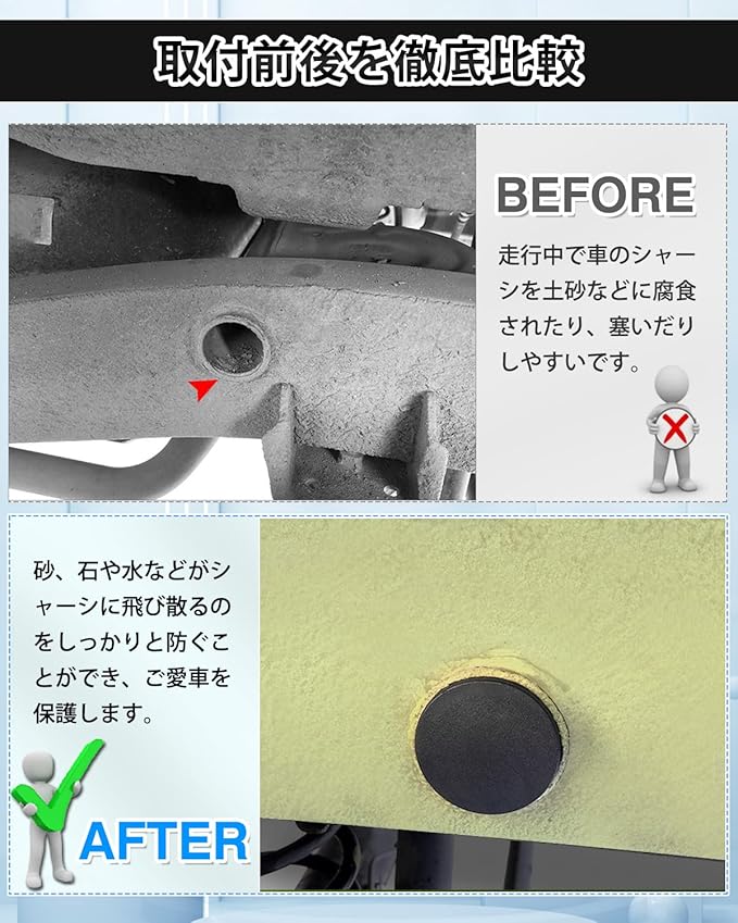3.【落下防止&取付簡単】: 取り出しも簡単で、取り付け面に残留物を残さずに工具で取り除くことができます。保護プラグを取り付けると、砂、石などがシャーシに飛び散るのをしっかりと防ぐことができ、愛車を効果的に保護します。