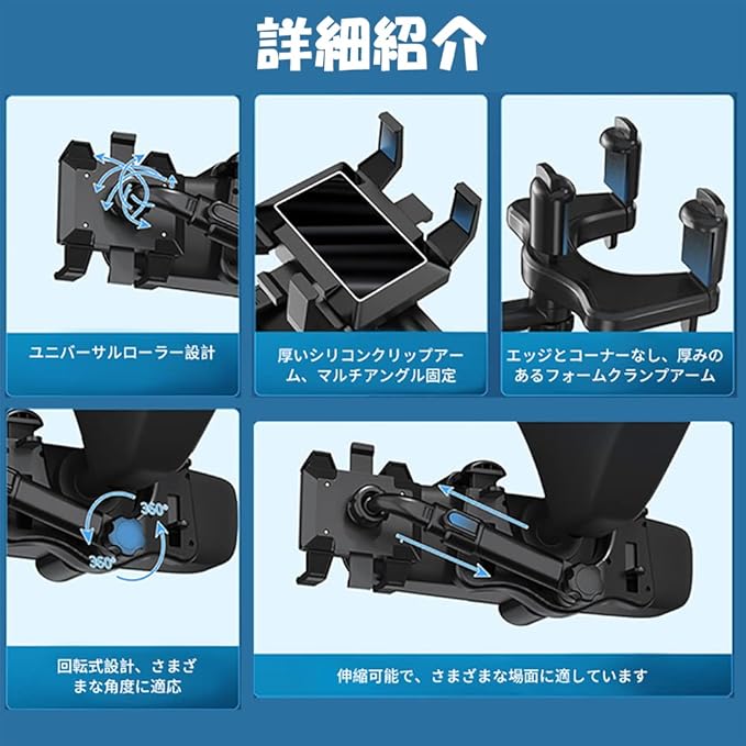 【こだわり設計・安全性抜群】アームの接触面にはソフトシリコン製の滑り止めゴムが付き、すまほに傷を与える心配が必要しません。アップグレードされたイーグル嘴設計になって、従来のクリップよりしっかり固定できます。挟む力も螺旋紐で締めて調節できます。四腕でスマホをきちんと固定し、減速ゾーンからの衝撃も有効的緩んで、運転中の道路振動しても安定させます。【ご注意】携帯電話の向きは自由に360度調整できますが、伸縮アームの向きはブラケット後ろのつまみを緩めて調整する必要があるため、運転中は調整しないことをお勧めします。