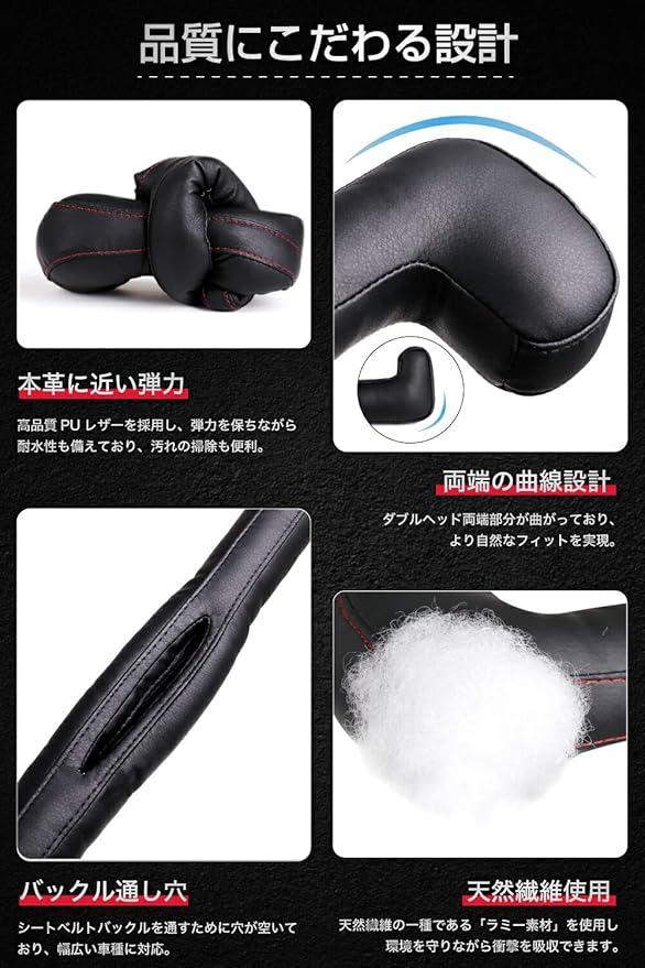 【進化版・ダブルヘッド型隙間クッション】 従来のストレート型は先端が浮いてしまったり、走行中の振動で外れることが多く、スネーク型はベルトのロック部を通すと浮いてしまったり、シートを前後にスライドした時に一緒に動かなく不便・・・それぞれにあった欠点をダブルヘッドによって克服しました。 隙間クッションの先が曲線になっていることで、違和感なく隙間が埋まりシートとコンソールに一体感がでます。