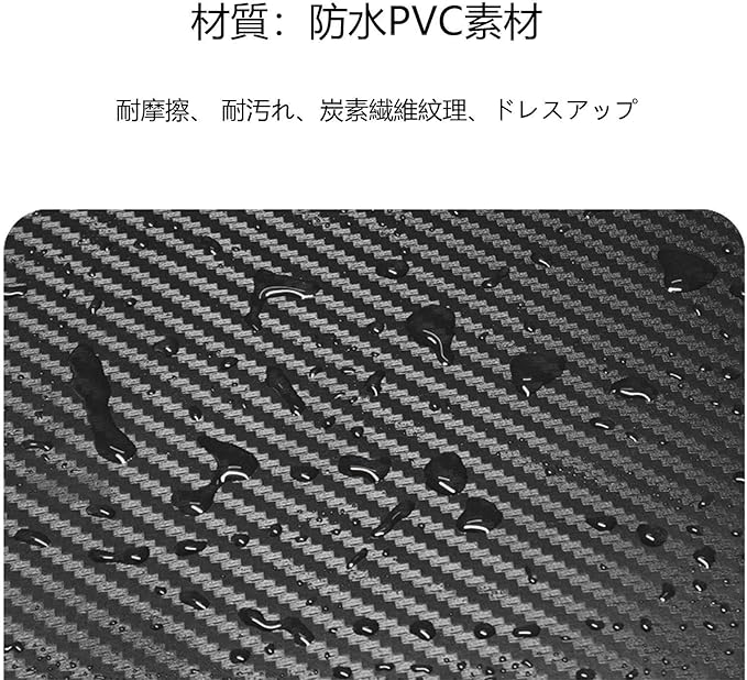 ②材質:防水PVC素材。耐摩擦、 耐汚れ、炭素繊維紋理、ドレスアップ