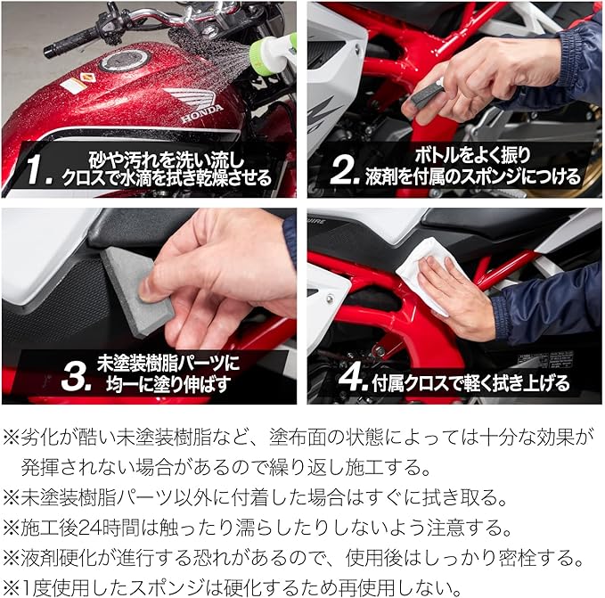 特徴 スポンジで塗り込んで、付属のクロスで拭くだけ, 二輪の未塗装樹脂パーツにも使用OK, 細部まで塗りやすい専用スポンジ付き, 自然な黒が蘇る, 造膜型高耐久ハイブリッドコーティングで長期耐久を実現