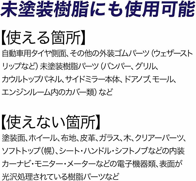 使用可能箇所: 自動車用タイヤ全般及びシボ加工の未塗装樹脂パーツ