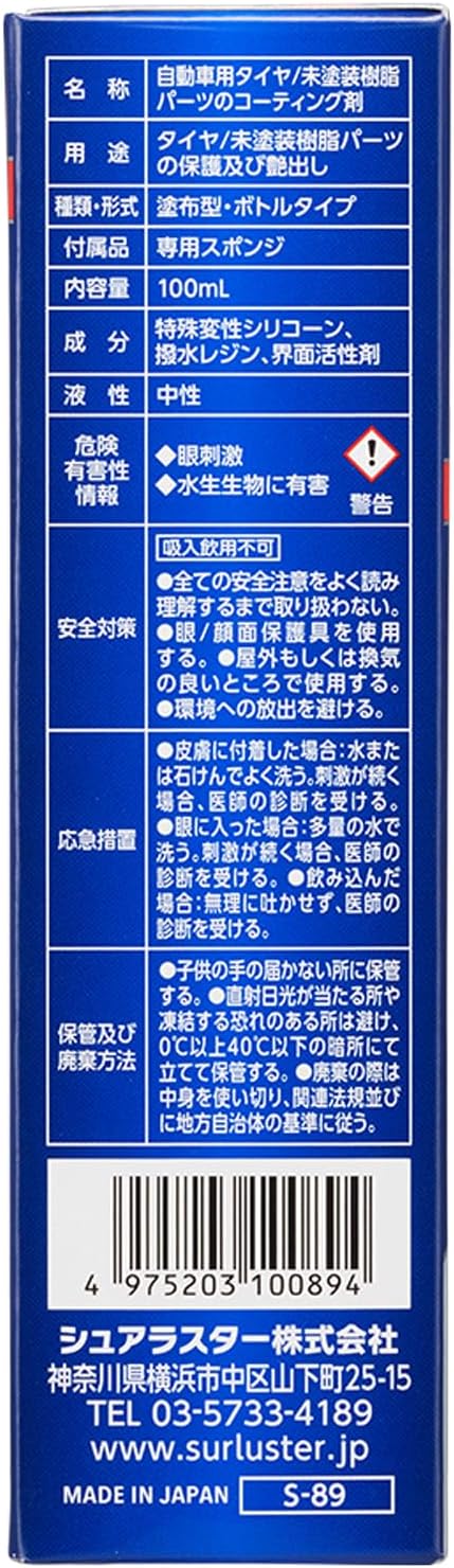 SurLuster(シュアラスター) タイヤコーティング+R 100ml 水性 塗りこみ 耐久性約6ヶ月 タイヤの艶出し 光沢 保護 ひび割れ防止 シリコーンオイル 乳液タイプ スポンジ付き 未塗装樹脂 中性 S-89