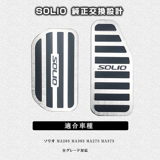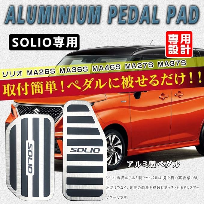 高級感のある、2ピースのアルミ製ペダル。ソリオ車オルガン式ペダル採用車に適合します。