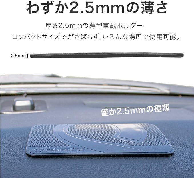 【わずか2.5mmの薄さ】厚さ2.5mmと超薄型の車載ホルダー。コンパクトサイズでかさばらずに、iPhoneなどの各種スマートフォンやちょっとした物置きとして、簡単に色んな場所に設置できます。