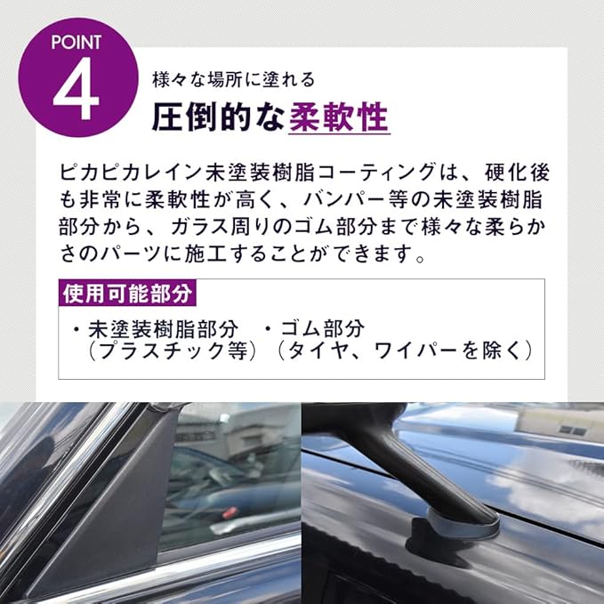 硬化後も非常に柔軟性が高く、バンパー 等の未塗装樹脂部分から、ガラス周りの ゴム部分まで様々な柔らかさの箇所に 施工することができます。
