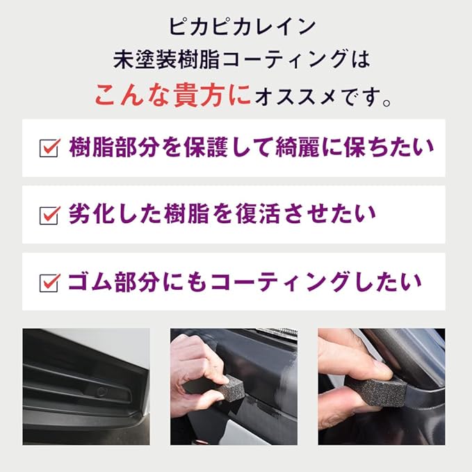 新車SUVの未塗装フェンダーなどの保護に!ピカピカレインから未塗装樹脂コーティングが登場しました。 高耐久のコーティング被膜で、樹脂部分を劣化から保護し、美しい状態をキープします。熱にも強く(耐熱300℃) 、エンジンルーム等にも施工可能。