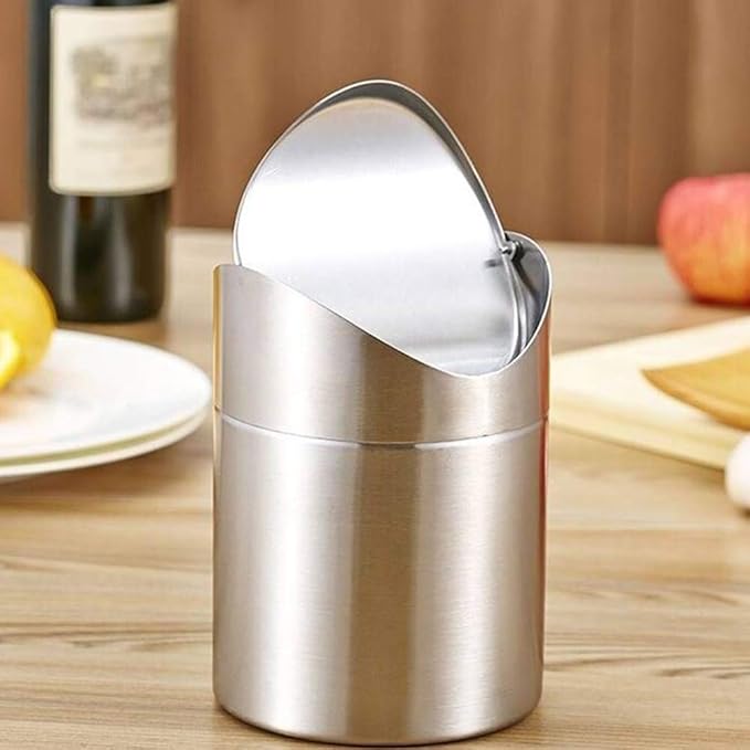 直径12.5cm、高さ16cmと小型で場所を取らない。 オフィスや自宅のデスクトップで使用できるステンレス製のミニデスクトップゴミ箱。