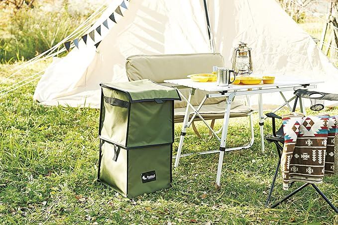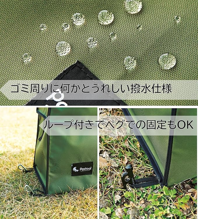 たたんでコンパクト、広げて大容量のゴミ箱。 45Lのゴミ袋がピッタリ収まる。袋を2枚セットして、ゴミの分別も可能。フタを留められる面テープ付。内側にゴミ袋を止めるベルト付き(6ヶ所)。袋を巻き込んでフックで固定。底面をテープで固定。1段だけで使用可。ペグを通せるループ付き(4ヶ所) 内側・外側にはっ水加工。 雨や液汚れに強い。