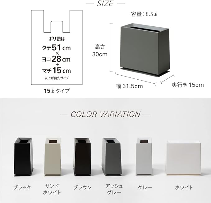 ゴミ袋は全体に設置する場合は縦51 横28cm+マチ15cm以上のもの、スリットをご利用の場合は縦50 横18cm+マチ15cm以上のものが使い勝手良くご利用いただけます。
