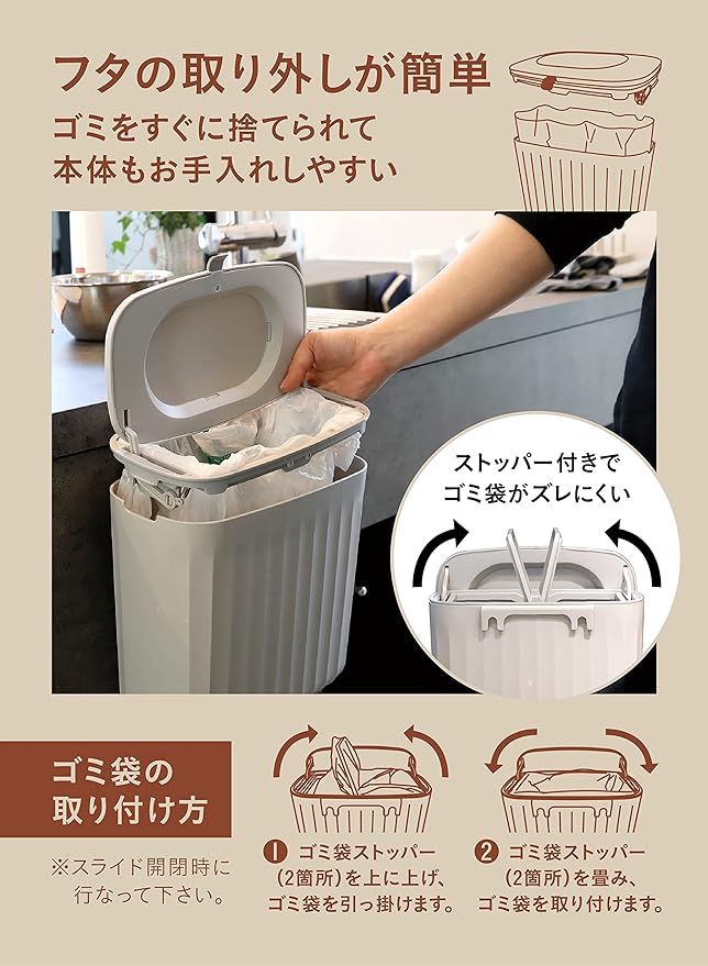 蓋を閉めることで調理中に出たゴミから出るニオイを防いでくれます。フタ部分を取り外すことが出来るので、ゴミ箱本体のお手入れがしやすく衛生的。ゴミ袋がズレにくいストッパー付きでしっかり固定します。