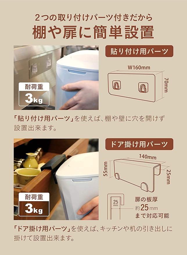 「貼り付けパーツ」を使えば、、壁や棚に穴を開けず設置が可能です。「ドア掛けパーツ」をを使えばキッチンや机の引き出しに掛けて設置が出来ます。使いたい場所に合わせたお好みの取り付け方が出来ます。