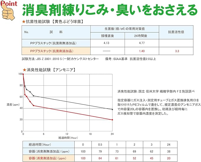 本体は抗菌剤・消臭剤練りこみ加工で、細菌の増殖を抑制し、悪臭やぬめりを抑える