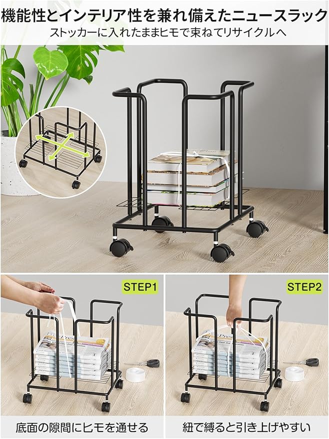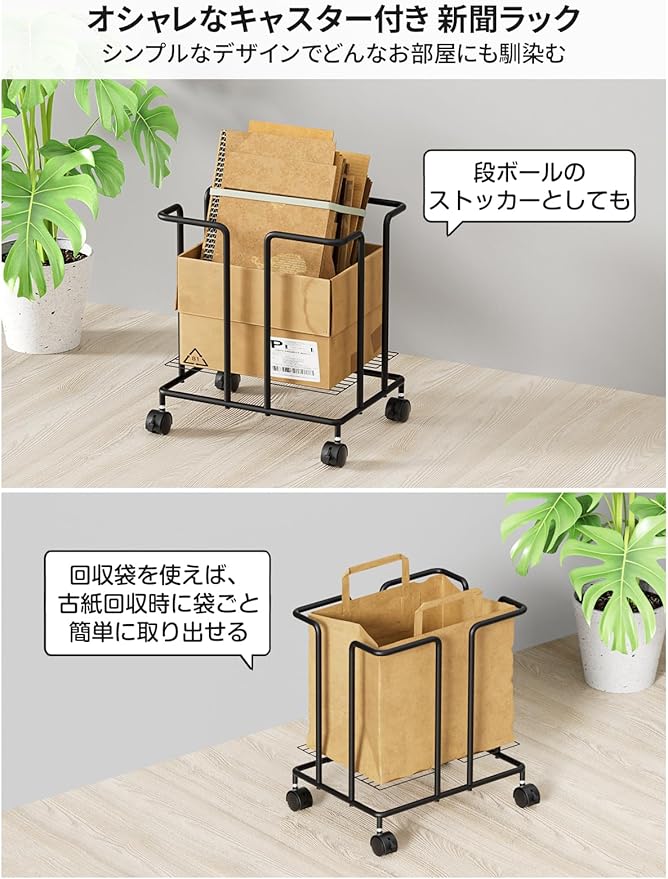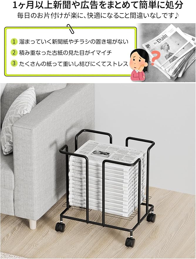TTWO 新聞ストッカー 耐荷重10kg 新聞紙ストッカー 新聞ラック 丈夫スチール製キャスター付き 新聞紙置き場 新聞ごみ A4 雑誌ストッカー ニューズラック バスケット 自宅 家庭用 会社 梱包便利 整理整頓 収納雑貨 インテリア オフィス お洒落 北欧 モダン 新聞入れ 新聞雑誌まとめ (ブラック)