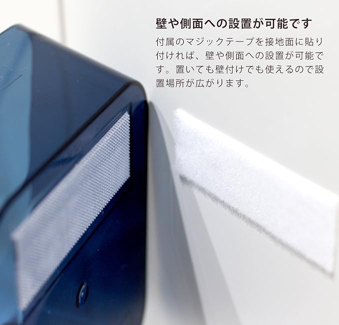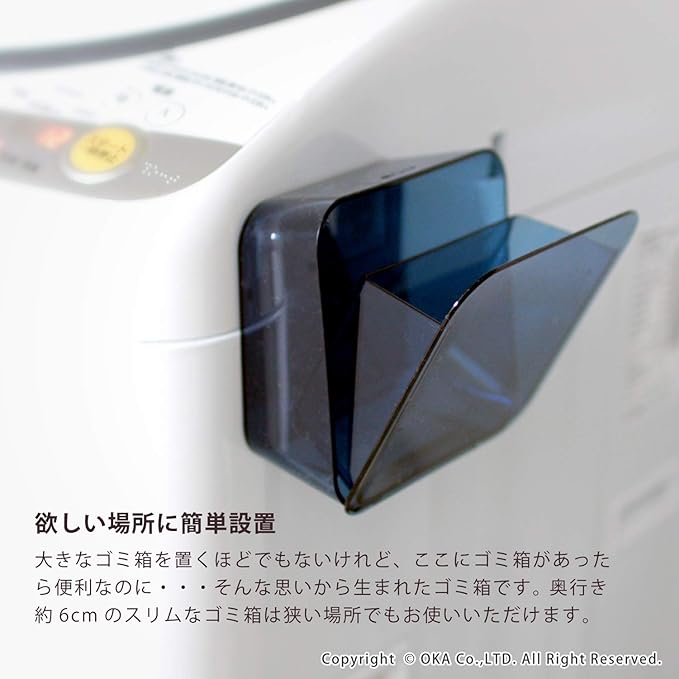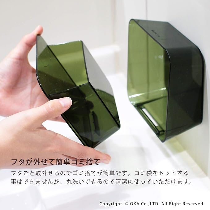 洗面台の上や、洗濯機の側面など置いても壁付けでも使えるので設置場所が広がります。フタごと取外せるのでゴミ捨てが簡単です。ゴミ袋をセットする事はできませんが、丸洗いできるので清潔に使っていただけます。清潔な印象を受ける透明感と、捨てたゴミがあまり目立たないちょうどいいクリア感にこだわって作りました。