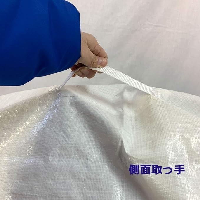 【素材:ポリカロンとは】 工事現場などで使用されているブルーシートと同様の生地となります。 正式名称は、ポリエチレン製防水ラミネートシートです。 材質は、糸の部分、防水加工のラミネート部分も全てポリエチレン(PE)で、防水性が高く、軽量な作業シートです。 防水・防風・防塵・目隠し等の目的では、現場作業から一般家庭まで幅広く使用されています。
