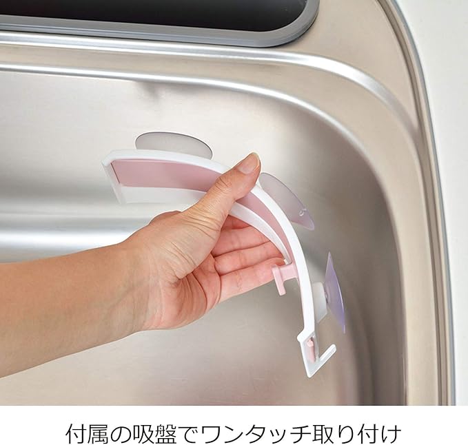 シンクのコーナーに吸盤で設置、スーパー等のポリ袋をワンタッチで取付ければ、ふた付きのごみ袋ホルダーに早変わり。