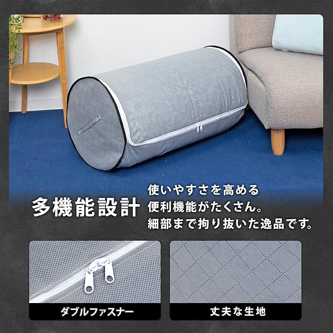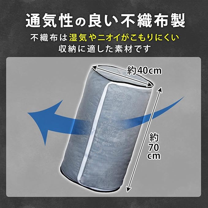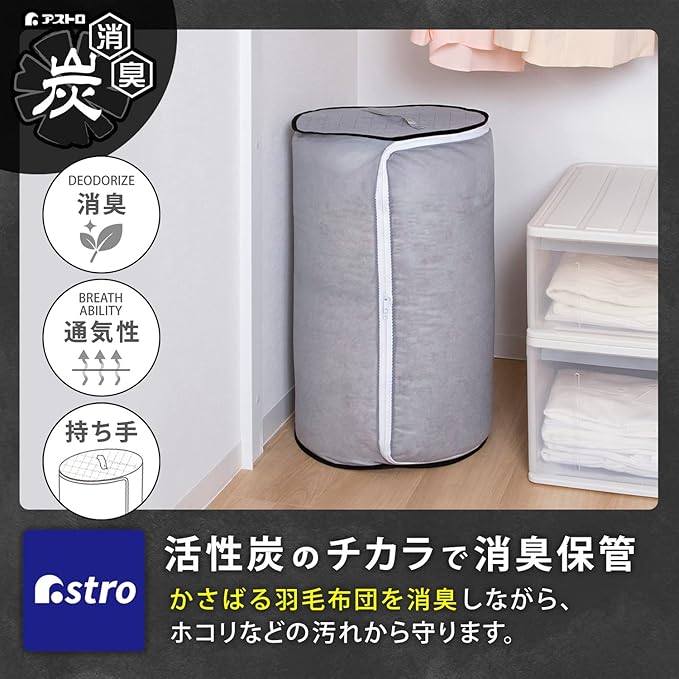 アストロ 活性炭消臭 羽毛布団収納袋 円柱形 シングル用 活性炭のチカラで消臭保管 立てて収納できるのでスッキリコンパクト 持ち手付きで持ち運びや移動がしやすい 通気性の良い不織布がホコリなどの汚れをガード 布団収納 布団袋 収納ケース 圧縮袋 グレー 171-43