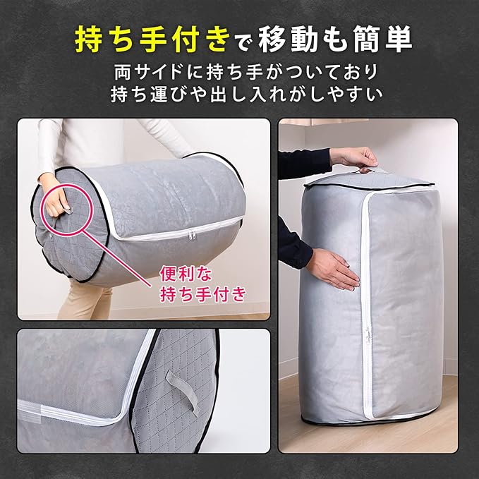 【羽毛布団をふんわりと保管】:圧縮しないので羽毛を傷めにくく、ふかふか感や暖かさを次のシーズンまでキープ。立てて収納できるのクローゼットや押入れの空間にスッキリ収納。収納場所からの出し入れや持ち運びがしやすい持ち手付き。