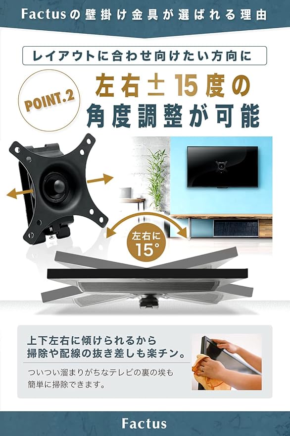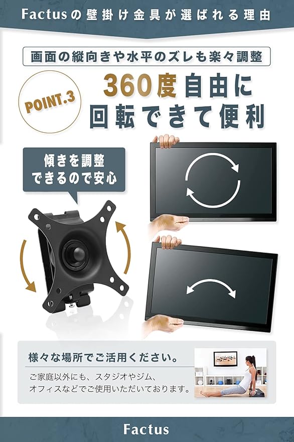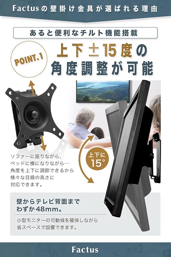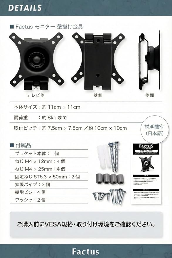factus モニター 壁掛け金具 VESA 液晶テレビ 12-24インチ対応 上下左右角度調節可能 耐荷重8kg ネジ 取説付き