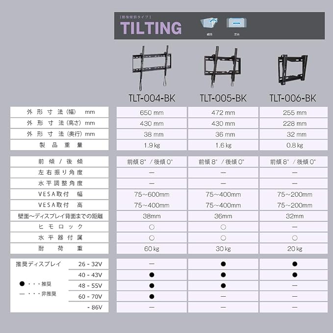 朝日木材加工 テレビ 壁掛け金具 WALL FIT MOUNT 26~43型 ブラック チルト TLT-006-BK