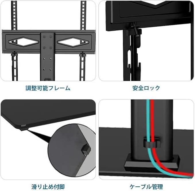 2WAYの様式:壁掛けとしてご利用いただけます,スタンドを取るだけで壁掛けとしてご利用可能で、とても使いやすい。TV台のベースが強化ガラスで作り、壊れにくく、製品の寿命が長くなります。ベースの下にもマットがあり、滑りにくく、回転台の安定を保つことができます。