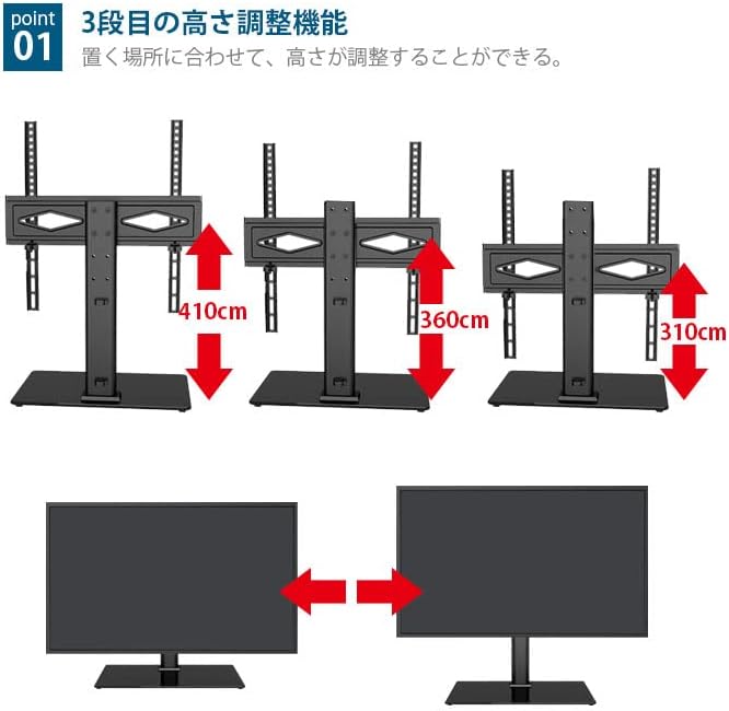 高さ調節可能:3段目の高さ調整があり、高さはそれぞれ310mm、360mm、410mm(取り付け部中心から台座まで)。お使い場合によって、最適なテレビの高さが調整でき、快適なポーズでテレビを見る壁寄せテレビスタンドです。